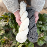 Not too bulky, not too light, aran weight is just right. Classic aran is perfect for your next knitting project - ideal for sweaters, mittens, and hats alike - or whatever you can dream up. Sometimes confused with worsted weight, aran weight is thicker with more air spun into each strand. Available in dark gray and white, our wool is always ready for your favorite natural dye or to be used simply as is. Our wool comes from our holistically-raised, rotationally-grazed, registered Leicester Longwool flock. Wool from this heritage breed is silky, soft, and has a unique sheen when knit into a garment. Perfect for at-home dye projects, this wool soaks up natural and synthetic dyes like a dream; though the undyed wool has a lot of character all on its own. Pure wool straight from our flock - no gimmicks, secrets, or synthetic surprises. Show us what you stitch up! Tag us in your posts on instagram @latebloomerranch.